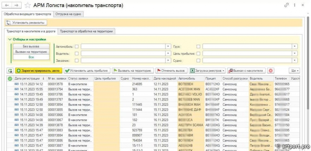 • Оптимізувати виклик транспорту: Простим натисканням кнопки «мишки» вибирати потрібні машини та миттєво сповіщати водіїв про необхідність виїзду на термінал, використовуючи Telegram-бот або систему автодозвону прямо з кабінету логіста. Це виключає необхідність обдзвонювати кожного водія, заощаджуючи час диспетчера.