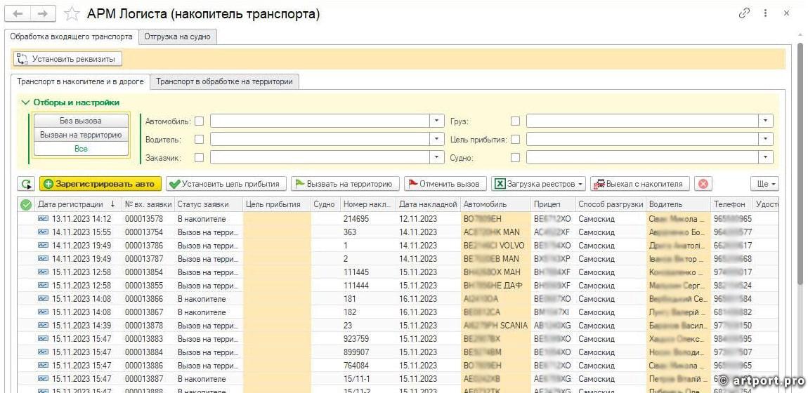 • Керувати всім логістичним потоком: Бачити транспорт, який ще в дорозі (за заявками з електронної черги) і вже знаходиться в накопичувачі або на території елеватора (терміналу). Логіст бачить критично важливі дані: номери машин, замовників і контракт, у рамках яких вони їдуть, найменування вантажів, тоннаж тощо.